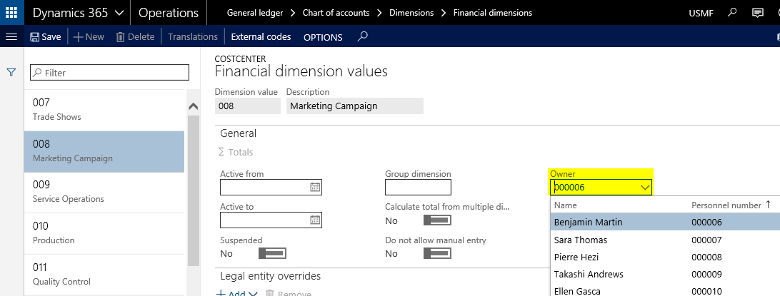 Um die eingehenden Rechnungen der richtigen Person, d.h. im ersten Schritt dem Besteller zuzuordnen ist es erforderlich, dass alle Mitarbeiter mit ihrer eignen Finanzdimension eingerichtet werden. Darüber hinaus muss jeder Mitarbeiter als Eigentümer (Owner) seiner eigenen Mitarbeiter-Finanzdimension eingerichtet sein, weil der Eigentümer der Finanzdimension definiert, welcher Mitarbeiter die sachliche Rechnungsprüfung durchzuführen hat. Der folgende Screenshot stellt diese Einrichtung für Nicole Holiday dar, welche die Marketingmaterialien bestellt hat.