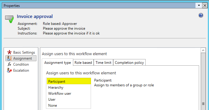 Die nächsten beiden Screenshots spezifizieren die Einrichtung des ersten Workflowschritts (Review invoice), der eine sachliche Rechnungsprüfung durch den Besteller (Nicole Holiday) erforderlich macht. Bitte beachten sie, dass Nicole Holiday hierbei nicht unmittelbar, sondern nur mittelbar über die Aufwendungsprüfergruppe ‚Orderer‘ bzw. die Finanzdimension ‚Mitarbeiter‘ referenziert wird.