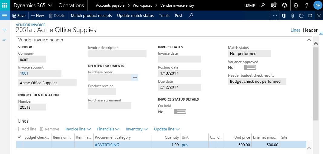 Basierend auf den obenstehenden Workfloweinstellungen wird im nächsten Schritt nun eine Kreditorenrechnung für Marketingmaterialien erfasst. Der nächste Screenshot zeigt die Rechnungserfassung in der Maske der ausstehenden Kreditorenrechnungen unter Verwendung der Beschaffungskategorie ‚Advertising‘ auf.