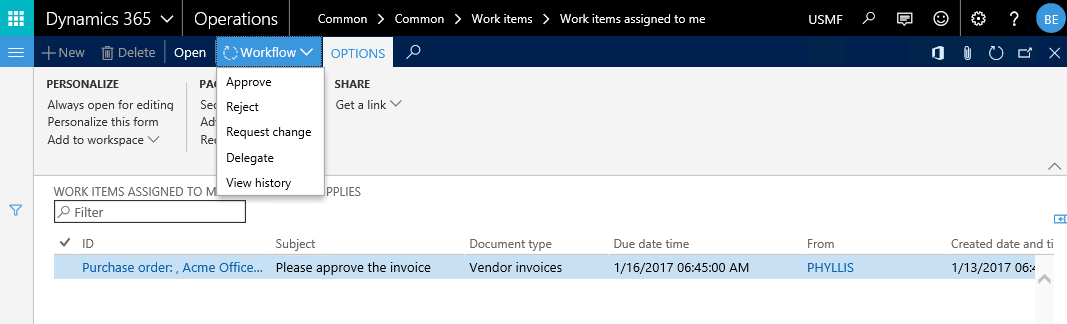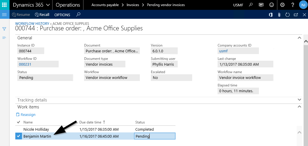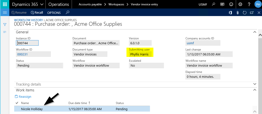 Nachdem alle Rechnungsinformationen erfasst wurden, wird der Rechnungsgenehmigungsworkflow durch einen Mitarbeiter der Kreditorenabteilung (Phyllis Harris) gestartet. Den Einstellungen des Workflows zufolge wird nun die erste Workflowaufgabe Nicole Holiday zugeordnet. Der folgende Screenshot zeigt dies beispielhaft auf.