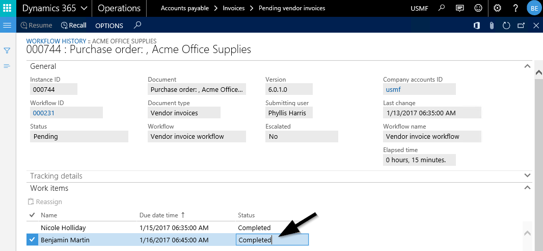 Unter der Annahme, dass Nicole Holiday ihren Prüfschritt mit ‚Complete‘ beendet hat, wird dieser weiter an Benjamin Martin geleitet, welcher für die Genehmigung der Rechnung zuständig ist.