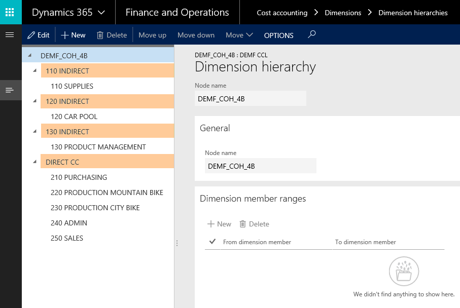 Um nun Umlagen basierend auf mehreren Dimensionhierarchieknoten einzurichten, sind im ersten Schritt die Dimensionsknoten einzurichten, sowie die zugehörigen Finanzdimensionen zuzuordnen. Im nächsten Screenshot ist dies beispielhaft dargestellt. Die dort aufgezeigte Dimensionshierarchie beinhaltet die neuen Knoten ‚110 INDIRECT‘, ‚120 INDIRECT‘ und ‚130 INDIRECT‘, welche jeweils eine eigene ‚indirekte‘ Hilfskostenstelle zugeordnet haben.