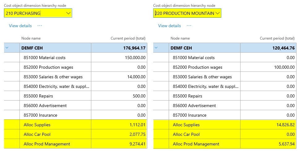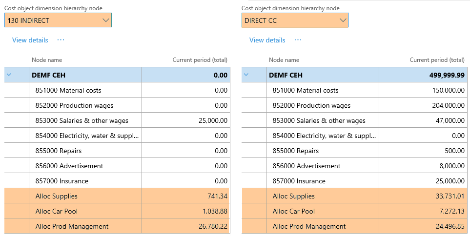 Alle Kostenstellen die schließlich dem Knoten ‚130 INDIRECT‘ zugeordnet wurden, werden entsprechend der auf den anderen Kostenstellen aufgelaufenen Gesamtkosten umgelegt, die über die hinterlegte Formel berechnet werden.