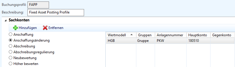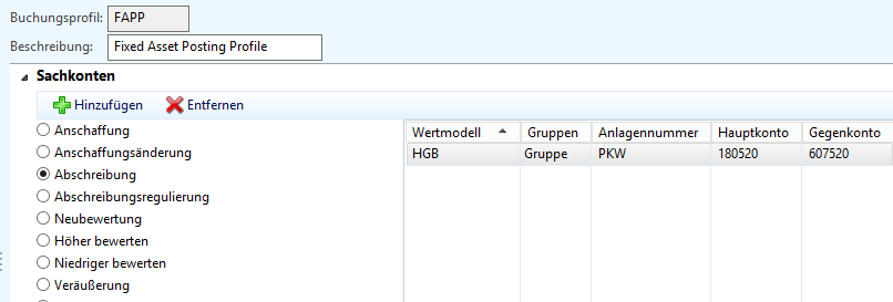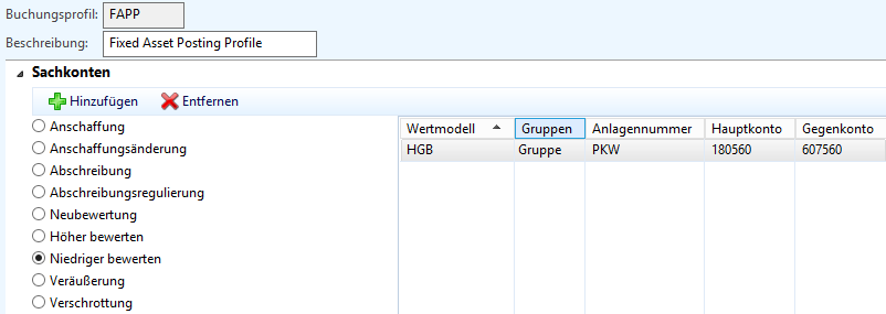 Die nachfolgenden Screenshots zeigen die im Rahmen des vorherigen Blog-Beitrags verwendeten Beispiel-Buchungseinstellungen auf. Zu beachten ist in diesem Zusammenhang, dass für jede Buchungskombination bestehend aus Wertmodell, Anlagengruppe und Anlagenbuchungsart eigene Sachkonten verwendet wurden.