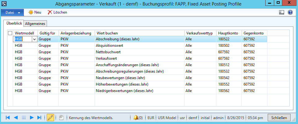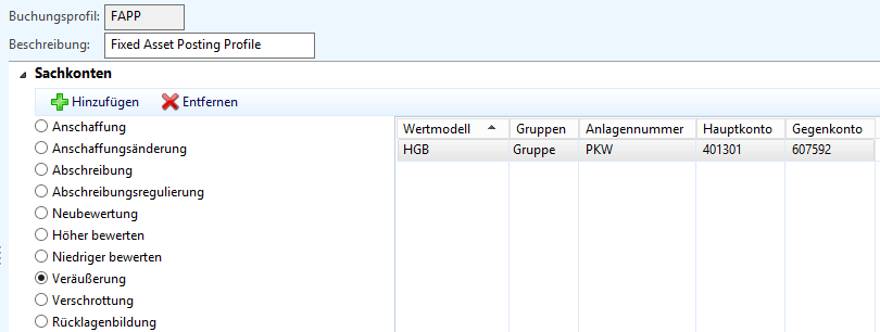 Die Abgangsparametereinstellungen für den Verkauf von Sachanlagen können natürlich detaillierter eingestellt werden als dies im verwendeten Beispiel realisiert wurde. Unabhängig hiervon ist in diesem Zusammenhang zu beachten, dass es sich bei den in der Hauptkontospalte hinterlegten Sachkonten um Unterkonten der zugehörigen Transaktionsart handelt. So werden bspw. Neubewertungen bilanzseitig über das Sachkonto 180540 abgebildet; die zugehörige Verkaufstransaktion werden allerdings über das zugehörige Unterkonto 180542 erfasst.
