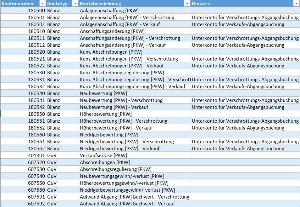 Der folgende Screenshot zeigt die im Beispiel verwendeten Sachkonten auf. Die in eckigen Klammern aufgeführten Kennzeichen repräsentieren die Anlagengruppe.