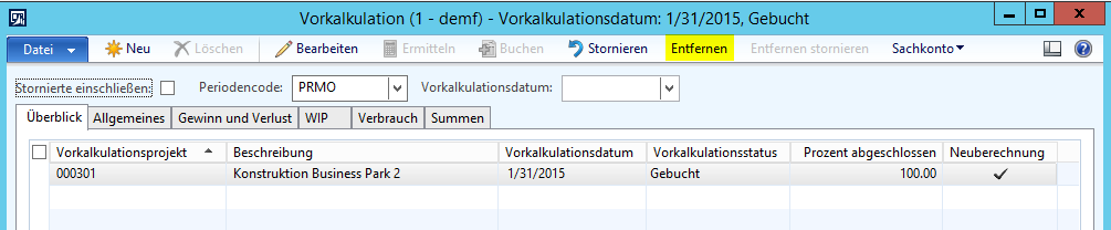 Um die Kosten tatsächlich auf die ausgewählte Sachanlage zu übertragen ist die gebuchte Vorkalkulation über die gleichnamige Funktion zu entfernen.