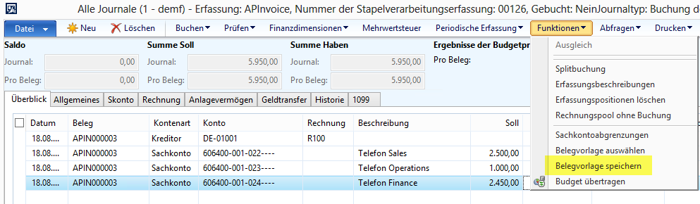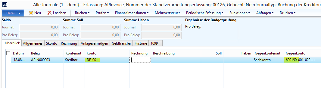 Mit der Buchung der Rücklieferungsgutschrift hat Dynamics AX schließlich die folgenden Sachkontobuchungen durchgeführt: