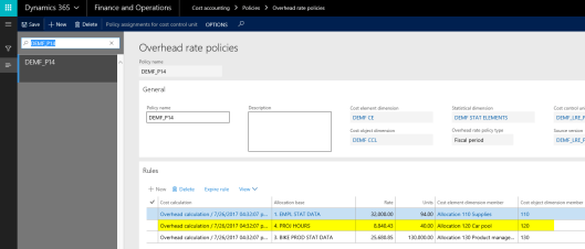 Die Gemeinkostensatzrichtlinie, die in diesem Beitrag verwendet wird unterscheidet sich von der zuvor verwendeten im Richtlinientypfeld („Finanzzeitraum“ statt „Benutzerspezifisch“). Aufgrund dieser Typfeldänderung kann kein Gemeinkostensatz manuell eingegeben werden, da D365 diesen automatisiert ermittelt.