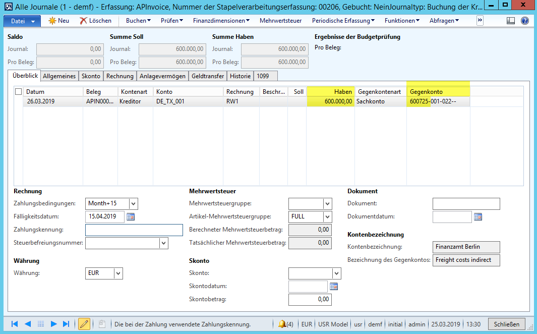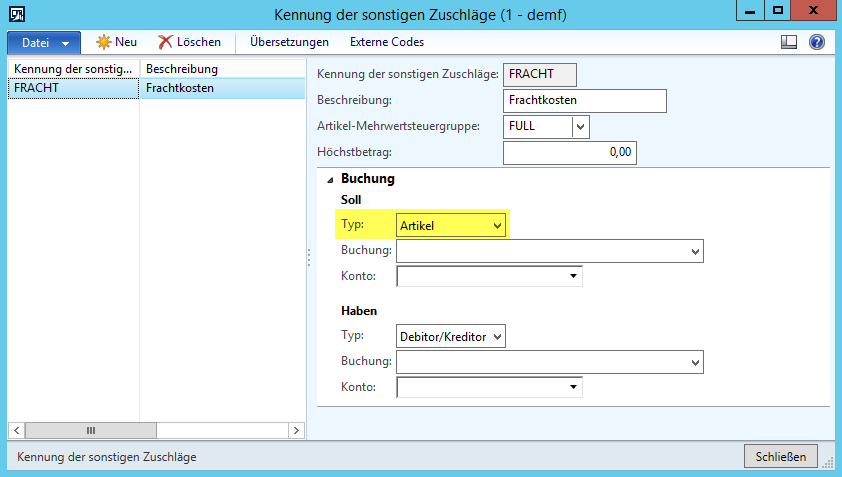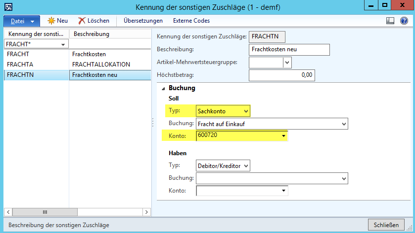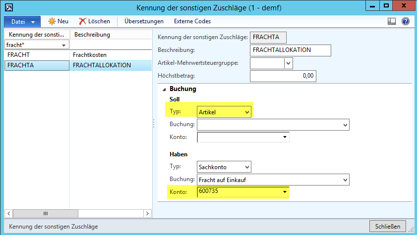 Um diese Unterbewertung in den Folgejahren zu vermeiden, wurde für das Folgejahr im ersten Schritt ein neuer sonstiger Zuschlag („FRACHTALLOKATION“) angelegt, der dafür Sorge trägt, dass die über diesen Zuschlag gebuchten Kosten die Anschaffungskosten der Artikel erhöhen. Als Gegenkonto wurde für die Habenbuchung ein Fracht-Verrechnungskonto (600735) verwendet.DE_15-6