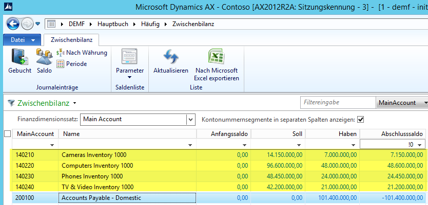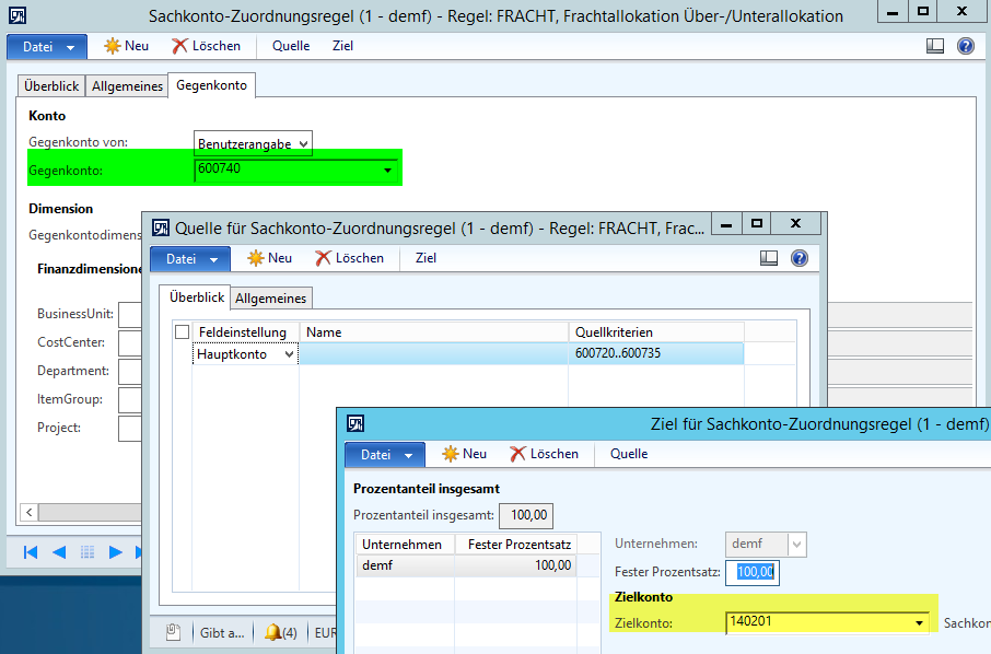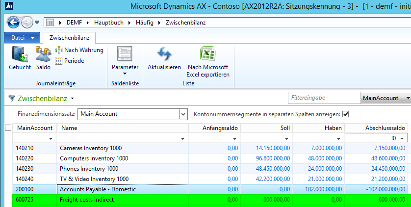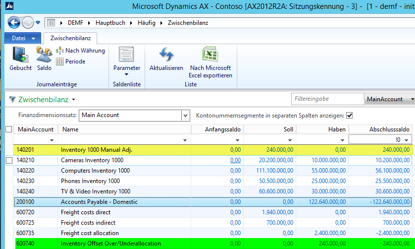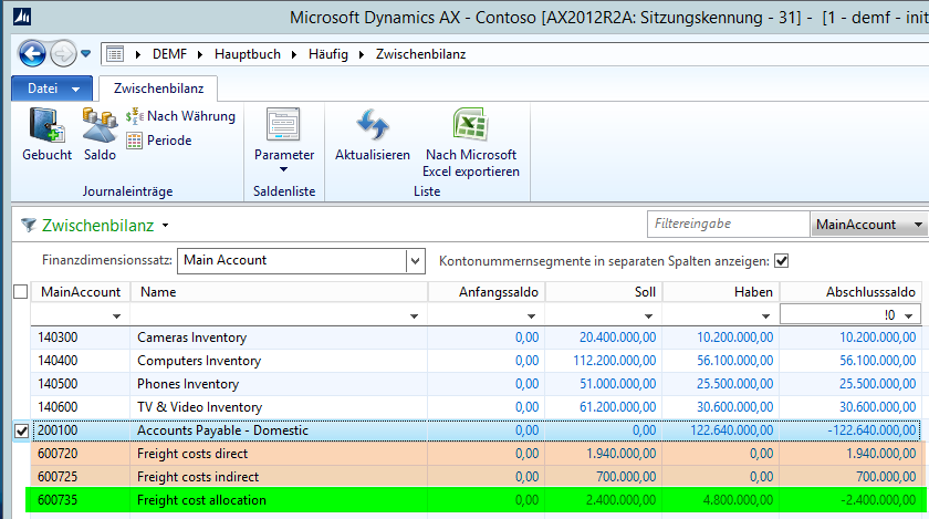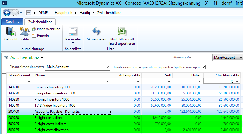 Dieser verbleibende Saldo wird – wie zuvor – über die gleiche Zuordnungsregel im Hauptbuch auf die Lagerbestandskonten im Hauptbuch verteilt, so dass letztendlich alle Frachtkosten, die auf den Konten 600720 bis 600740 erfasst wurden, auf die Bestandskonten in der Bilanz verteilt sind.