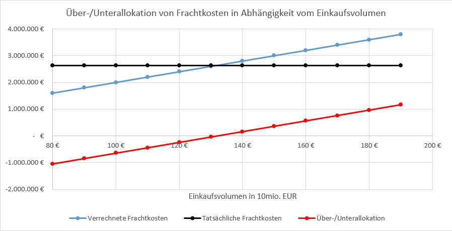 Die folgende Grafik stellt den Zusammenhang zwischen den tatsächlich angefallenen Frachtkosten, den über den Automatikzuschlag verrechneten Frachtkosten sowie der auftretenden Über-/Unterallokation dar.