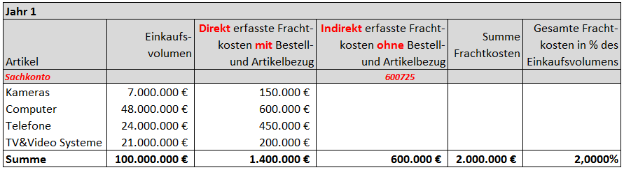 Neben diesen direkt zuordenbaren Frachtkosten wurden 600 TEUR an Frachtkosten gebucht, die keinem Artikel bzw. keiner Bestellung unmittelbar zugeordnet werden konnten. Die derart von Lieferanten in Rechnung gestellten Frachtkosten wurden über Rechnungserfassungsjournale sofort erfolgswirksam in der Gewinn- und Verlustrechnung (GuV) auf dem Konto 600725 erfasst.DE_15-4