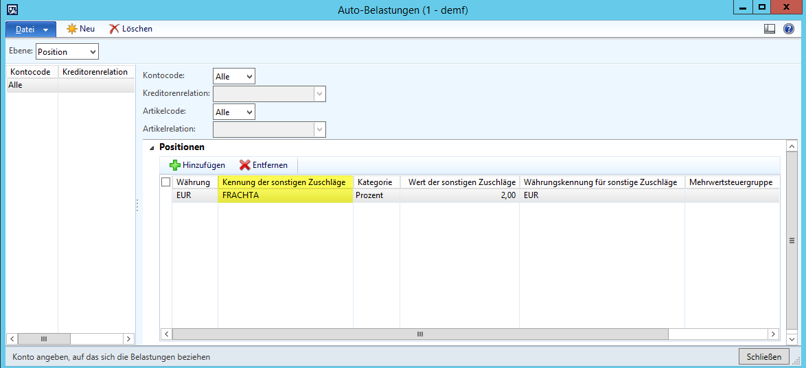 Der derart eingerichtete sonstige Zuschlag wurde im zweiten Schritt als sog. automatischer Zuschlag hinterlegt, welcher dafür sorgt, dass bei jeder Bestellbuchung einen Zuschlag in Höhe von 2% des Warenwertes bilanziell erfasst wird. (Hinweis: Der Prozentwert von 2% wurde basierend auf den im vergangenen Jahr tatsächlich angefallenen Frachtkosten im Verhältnis zum Einkaufsvolumen ermittelt).