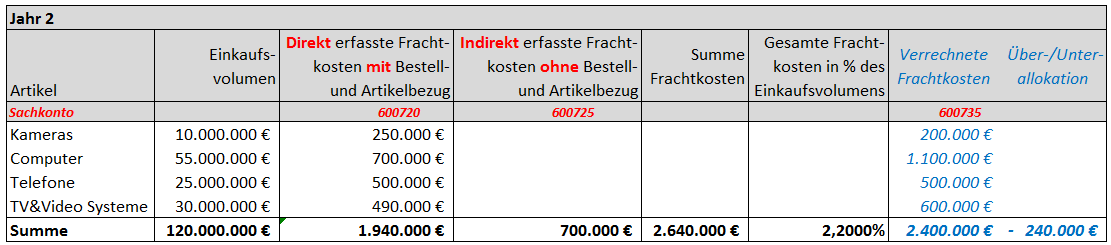 Im folgenden Jahr traten nun 2,64 mio. EUR an direkt und indirekt erfassbaren Frachtkosten auf, die alle erfolgswirksam in der GuV auf den Sachkonten 600720 bzw. 600725 erfasst wurden. Aufgrund des eingerichteten Automatikzuschlags wurden hiervon 2,4 mio. EUR auf den Artikelbestand über das Sachkonto 600735 verrechnet und in der Bilanz aktiviert. Die insgesamt verbleibende Differenz in Höhe von 240 TEUR – welche sich aus der Summe der auf den Frachtkostenkonten 600720, 600725 und 600735 gebuchten Beträge ergibt – stellt demnach den Betrag dar um den die Lagerbestände insgesamt unterbewertet sind.