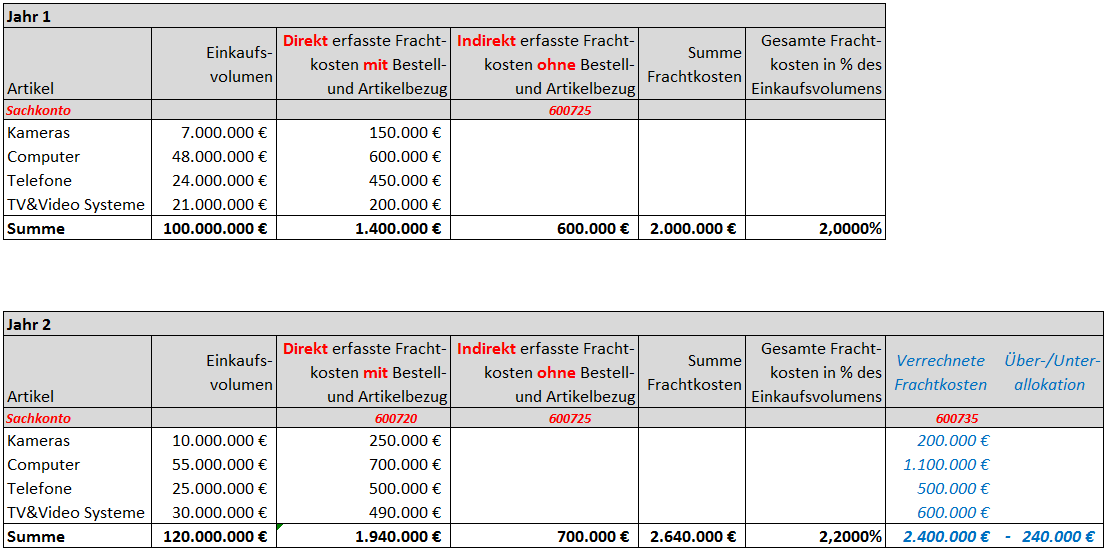 Ausgangspunkt ist das im vorherigen Blog-Beitrag verwendete Beispiel, bei dem in einem bestimmten Jahr für ein Einkaufsvolumen von 100 mio. EUR direkt zuordenbare Frachtkosten in Höhe von 1,4 mio. EUR und indirekte, d.h. keinen Artikeln / Bestellungen unmittelbare zuordenbare Frachtkosten in Höhe von 600 TEUR entstanden. Im Folgejahr fielen bei einem Einkaufsvolumen von 120 mio. EUR insgesamt 2,64 mio. an Frachtkosten an, die im vorherigen Beitrag über die Einrichtung von automatischen sonstigen Zuschlägen sowie einer Zuordnungsregel im Hauptbuch auf die Lagerbestandskonten verteilt wurden.