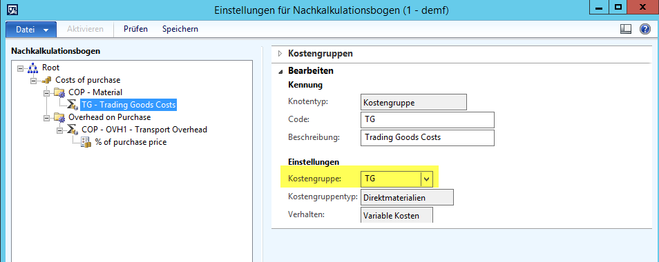 Die Kostengruppe wird im zweiten Schritt im Nachkalkulationsbogen hinterlegt.