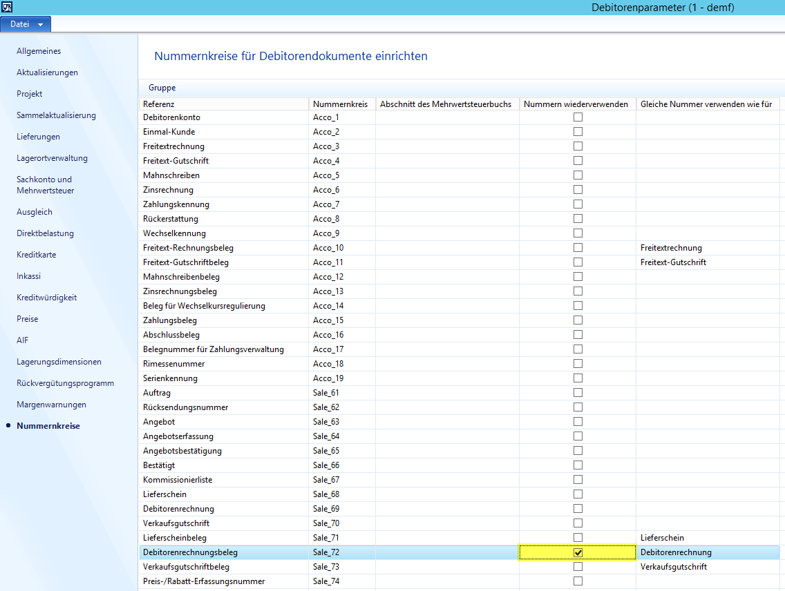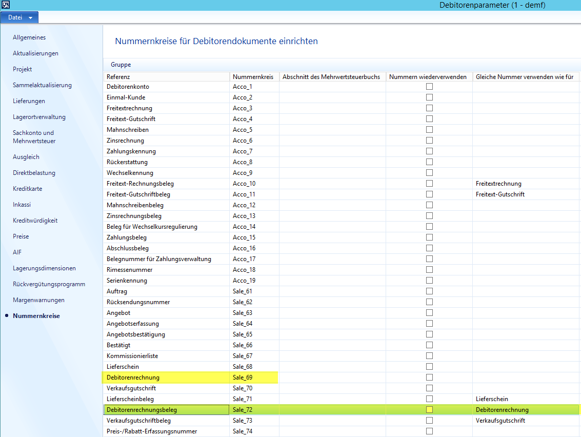 Ausgangspunkt für dieses Beispiel ist die Hinterlegung des Nummernkreises „Sale_69“ für Debitorenrechnungen und „Sale_72“ für den Debitorenrechnungsbeleg. Siehe hierzu den folgenden Screenshot.