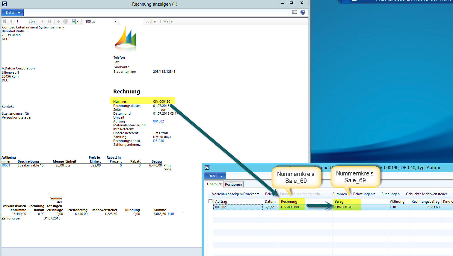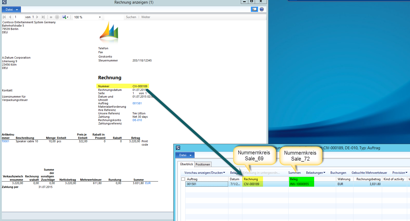 Wird nun ein Kundenauftrag fakturiert, so verwendet Dynamics AX für das Rechnungsdokument eine Nummer aus dem Nummernkreis „Sale_69“ und für den Fibu-Buchungsbeleg eine Nummer aus dem Nummernkreis „Sale_72“ wie nachfolgend dargestellt.