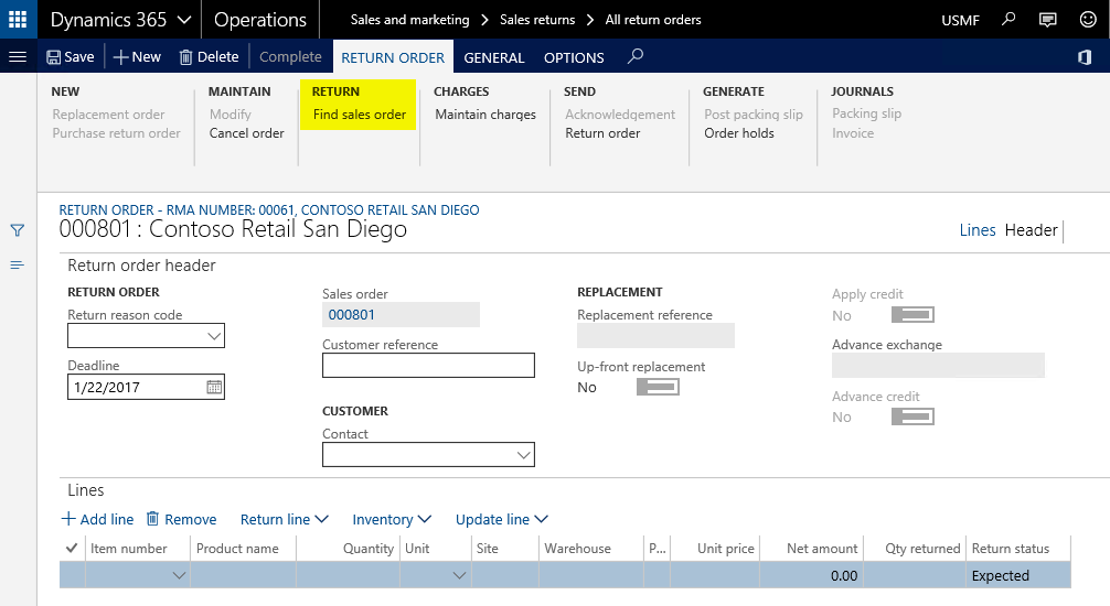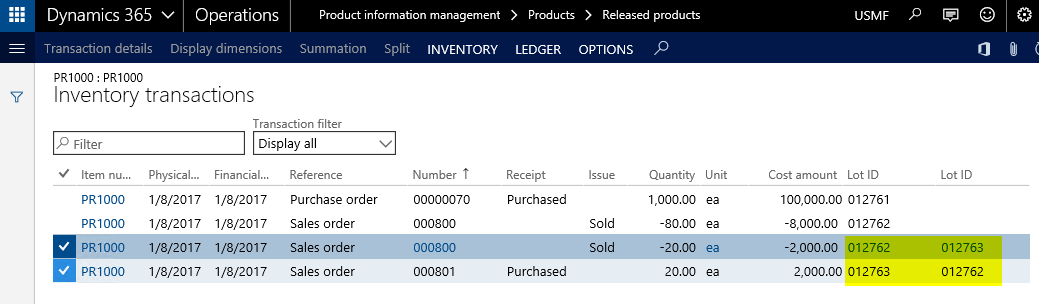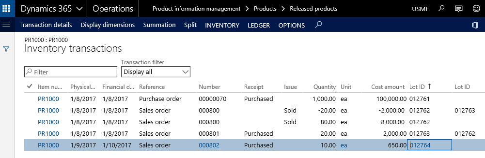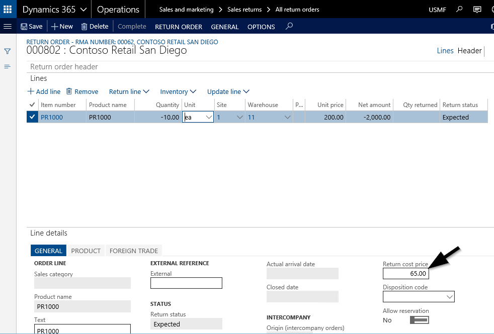 Acht Tage später hat der Kunde 10 Stück der verkauften Produkte retourniert. Diese Rückgabe wurde in Dynamics AX über die folgende Rücklieferung abgebildet.